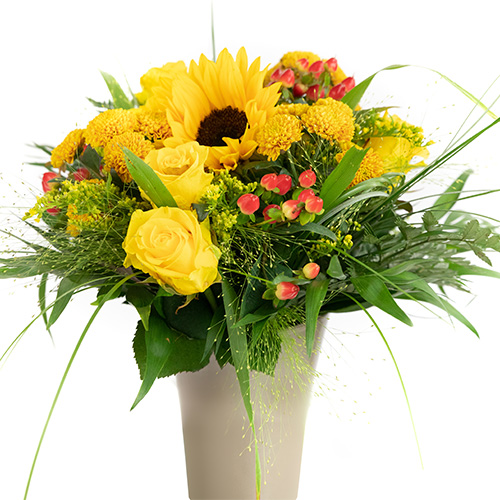 Sonnenblumen, gelbe Rosen, rotes Hypernicum, gelbe Santini und Solitago,